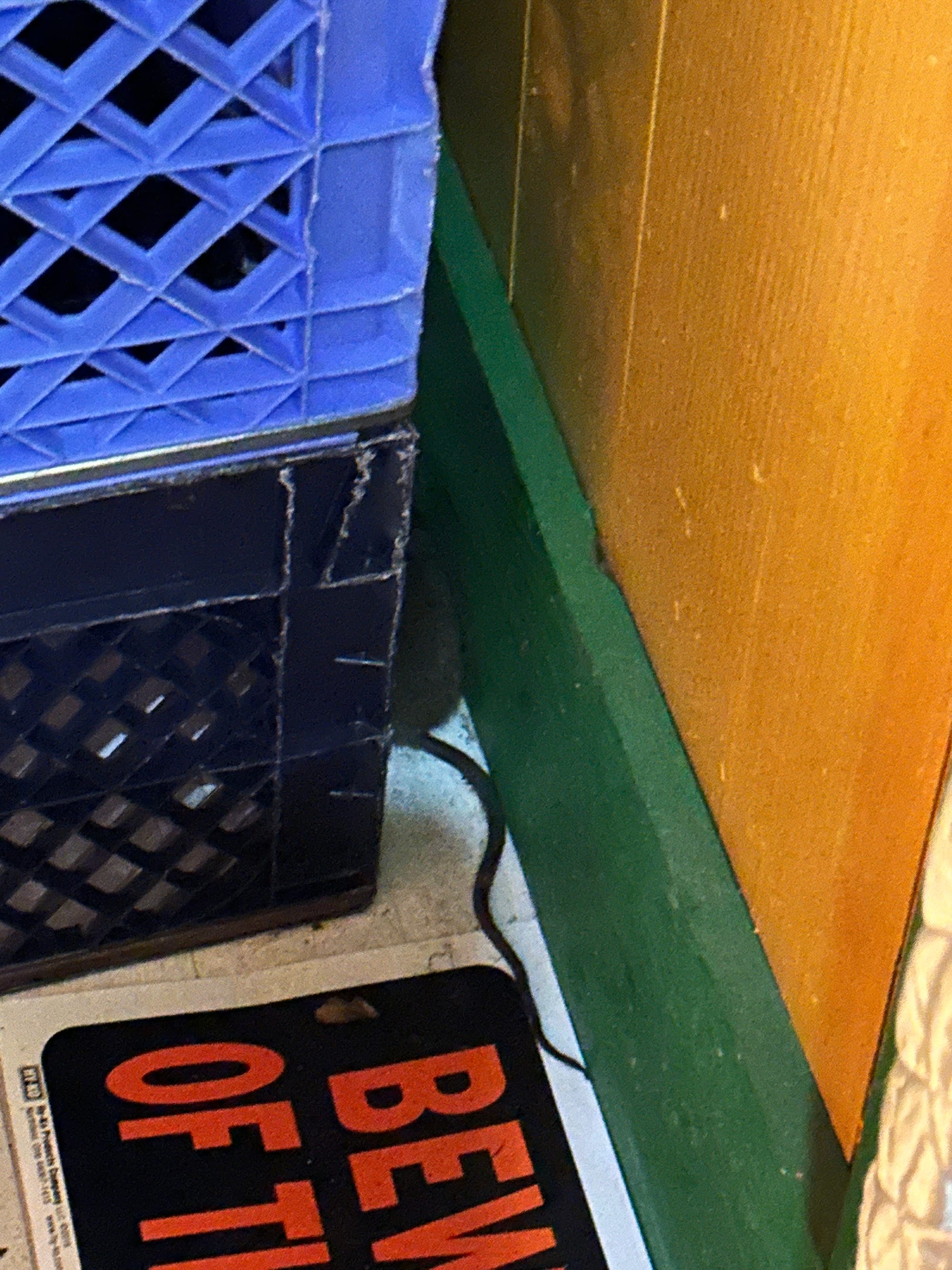 The house was dry, but it was not without other surprises. The week before I left for Portland, I discovered that “something” had been trying to get into a mouse-bait station I’d placed in the storage room off the kitchen. I got my flashlight and duct tape and looked for any possible entrance a larger-than-mouse animal could have used to get into this room. I found and sealed all possible intrusions, but left a big piece of bait out, just in case I hadn’t. The next day, the bait was gone. I left out more, but that bait sat. When I came back from Portland, the bait inside and outside were untouched. All quiet on the storage room front. There was, however, a smell emanating from the “foyer”, the 3 square foot area between the front door, living room, and stairs. Far from the storage room. I figured that it was the body of whoever had stolen that bait, rotting in the crawlspace below. I was wrong.