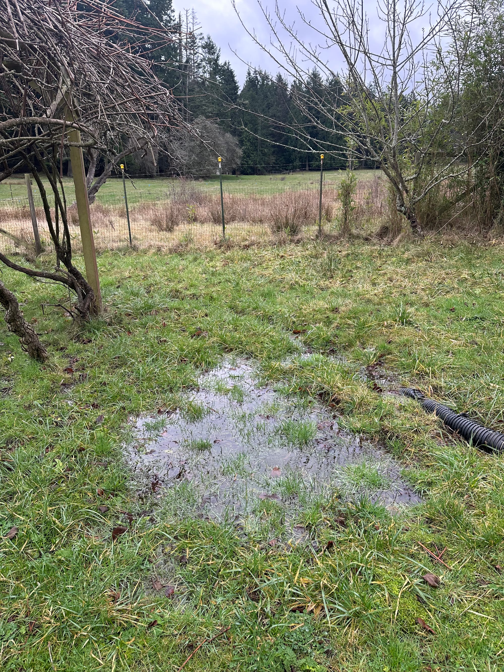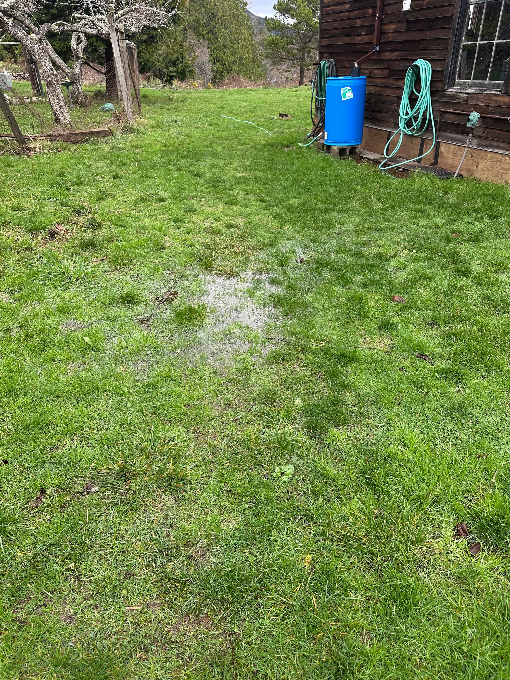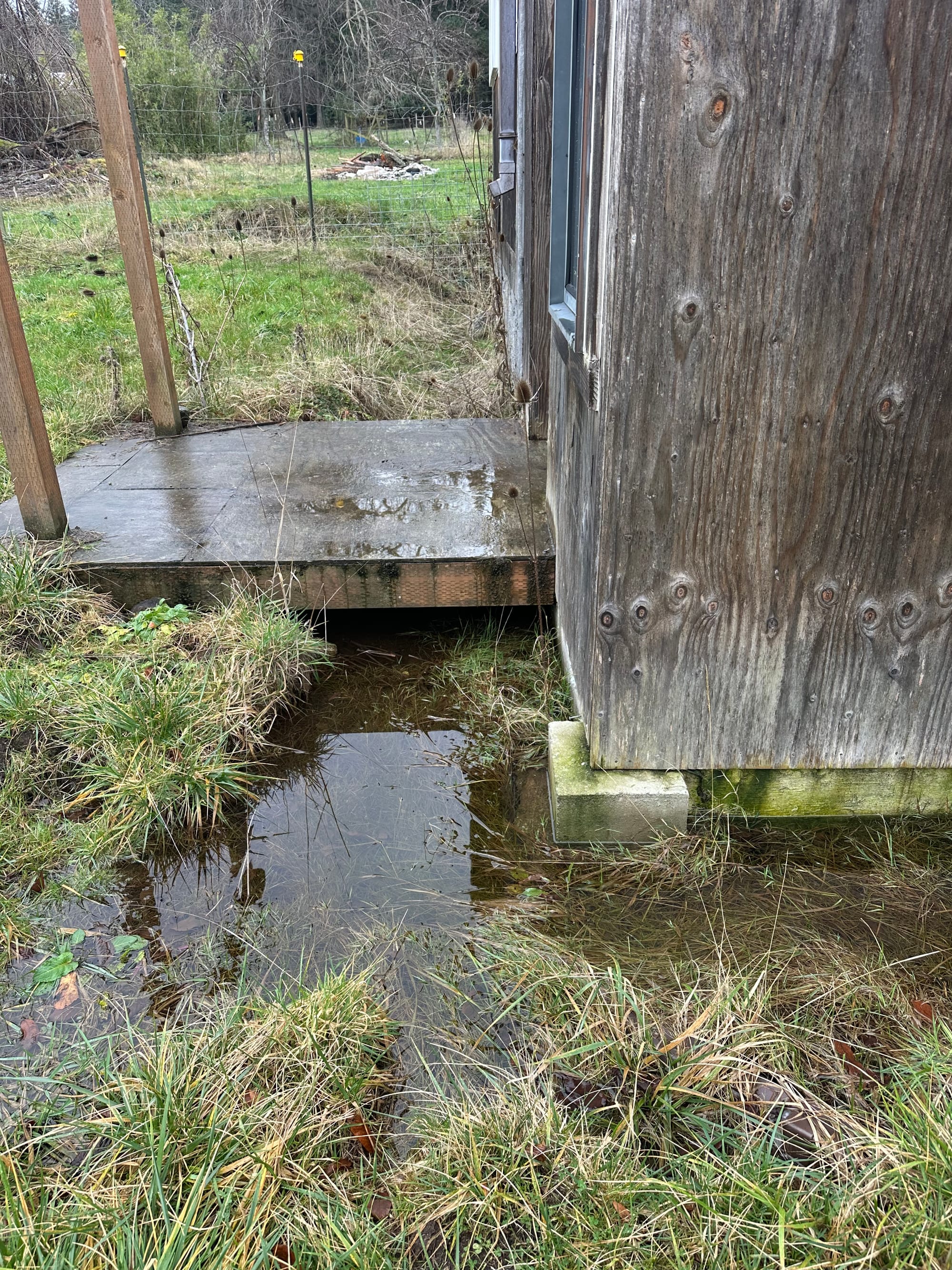 When I drove back to Orcas in my rental car, the rains hadn’t ended, but the worst of the flooding had passed. The property was, and still is, saturated. Wherever you are not dodging puddles, the ground has absorbed all that it can and squishes like a wet sponge. Seeing all the places water collects on the property will eventually help me to figure out the best and worst places to plant garden beds and where curtain drains will be the most effective. A good deal of water got into the crawlspace but fortunately, not the house. The repairs I made to the roof weren’t quite enough to counter the batshit crazy contours of the rooflines, but the only place rainwater is getting in from above is in the small, exterior-entrance utility room.