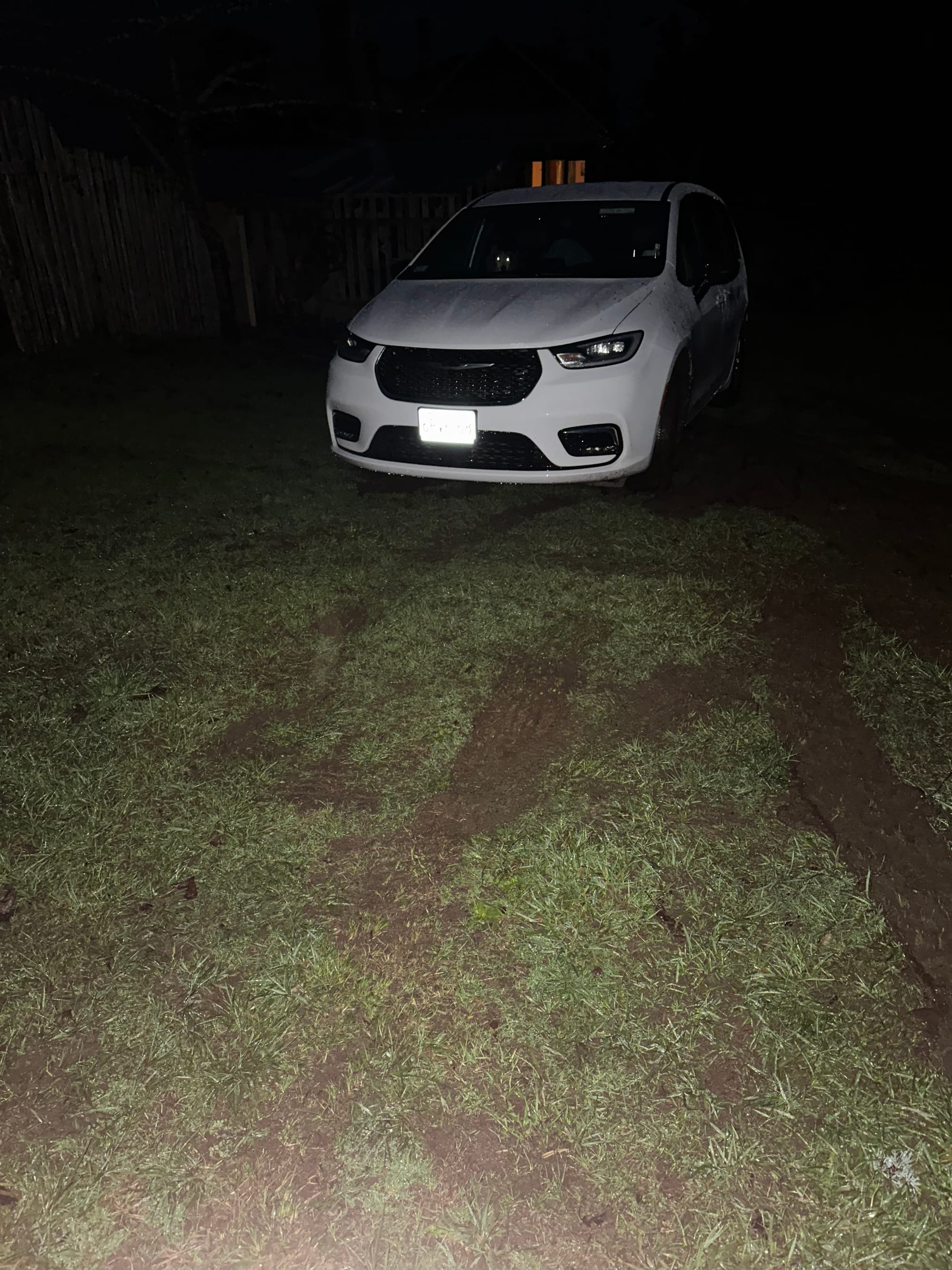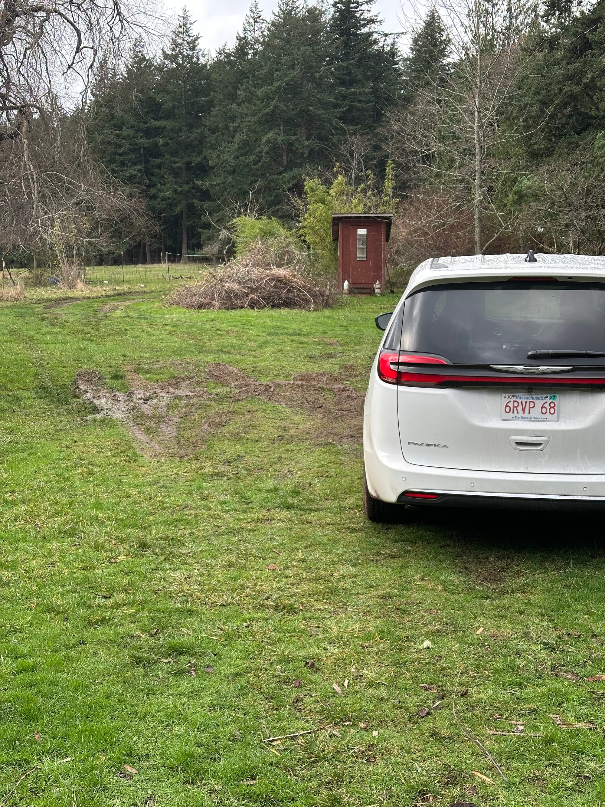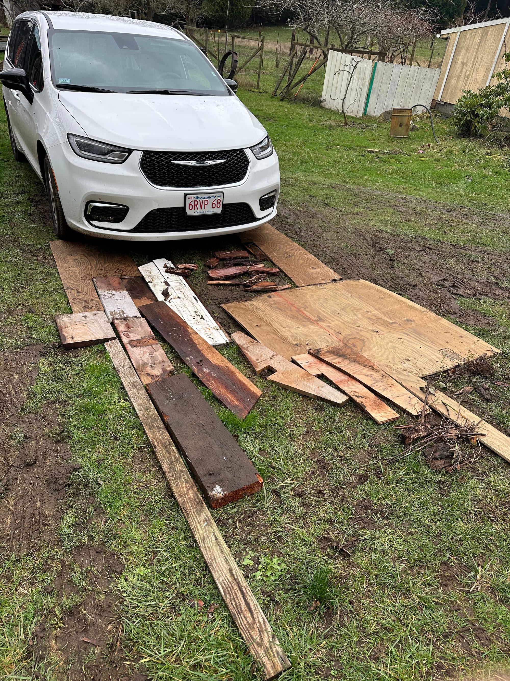 After 8 hours of Matthew Rhys dreams and a couple YouTube tutorials, my solstice-day plans were to liberate The Pacifica from the slope. I gathered plywood, 2x4s, and woodpile scraps and assembled a traction field over a portion of the slope. I didn’t get the purchase I needed in my first attempt, and before launching a second, I decided to try a different route. This involved backing up the car and driving it about 30 feet across a fenced garden, and then up the hill that leads to the cabin. On paper, this was an idiotic move. The patch of lawn I had to drive over to get to the hill was some of the most saturated on the property, and last winter a moving truck had to be towed from that hill. The only thing I had working for me was the fact that this ground was relatively virginal; it hadn’t known a tire-tread in months. There was a decent chance, I posited, that the un-treadded grass would give me the traction I needed to make it up the hill, once. And for once, I was right.