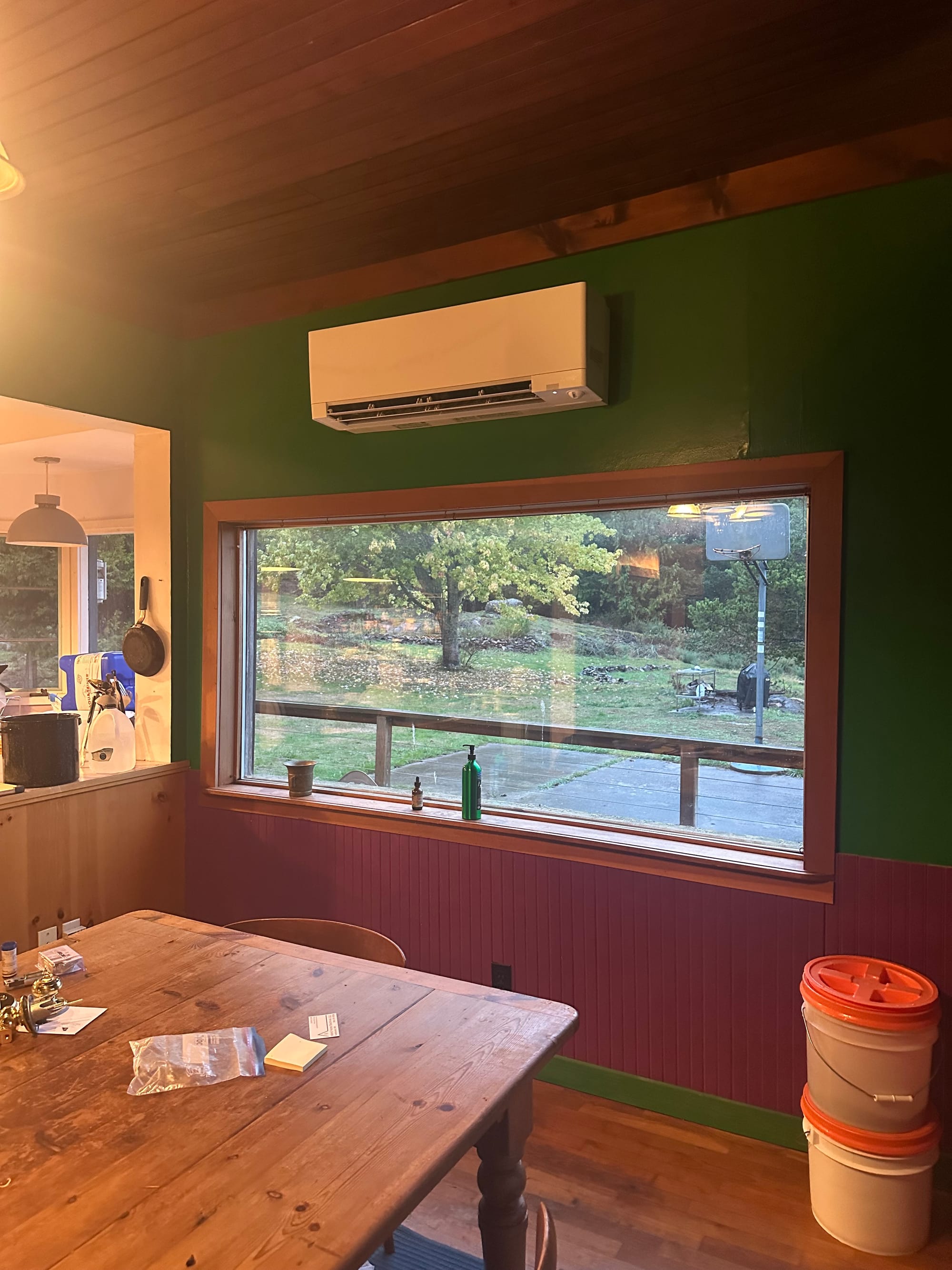 The last 3 weeks have been a flurry of addition, subtraction, and substitution, mostly in service to winter preparation: firing up a dehumidifier and moving bedrooms, installing a heat pump and mini split for the kitchen/dining area and new wood stove for the living room, taking out kitchen cabinets, ripping out molded drywall and an inefficient water heater from the creepy utility room and installing fresh plywood for a (temporarily) clean and dry space, removing an old, rotting set of French Doors and replacing them with new, insulated and ultra-weatherproof doors, fixing the jankiest downspouts and gutters (the whole gutter system is a mess), and replacing damaged exterior baseboard around the house with plywood, to keep the rodents out of the crawlspace and house. Cleaning out duct work, aka mouse skyways, from crawlspace and laying down vapor barrier is next on the list.